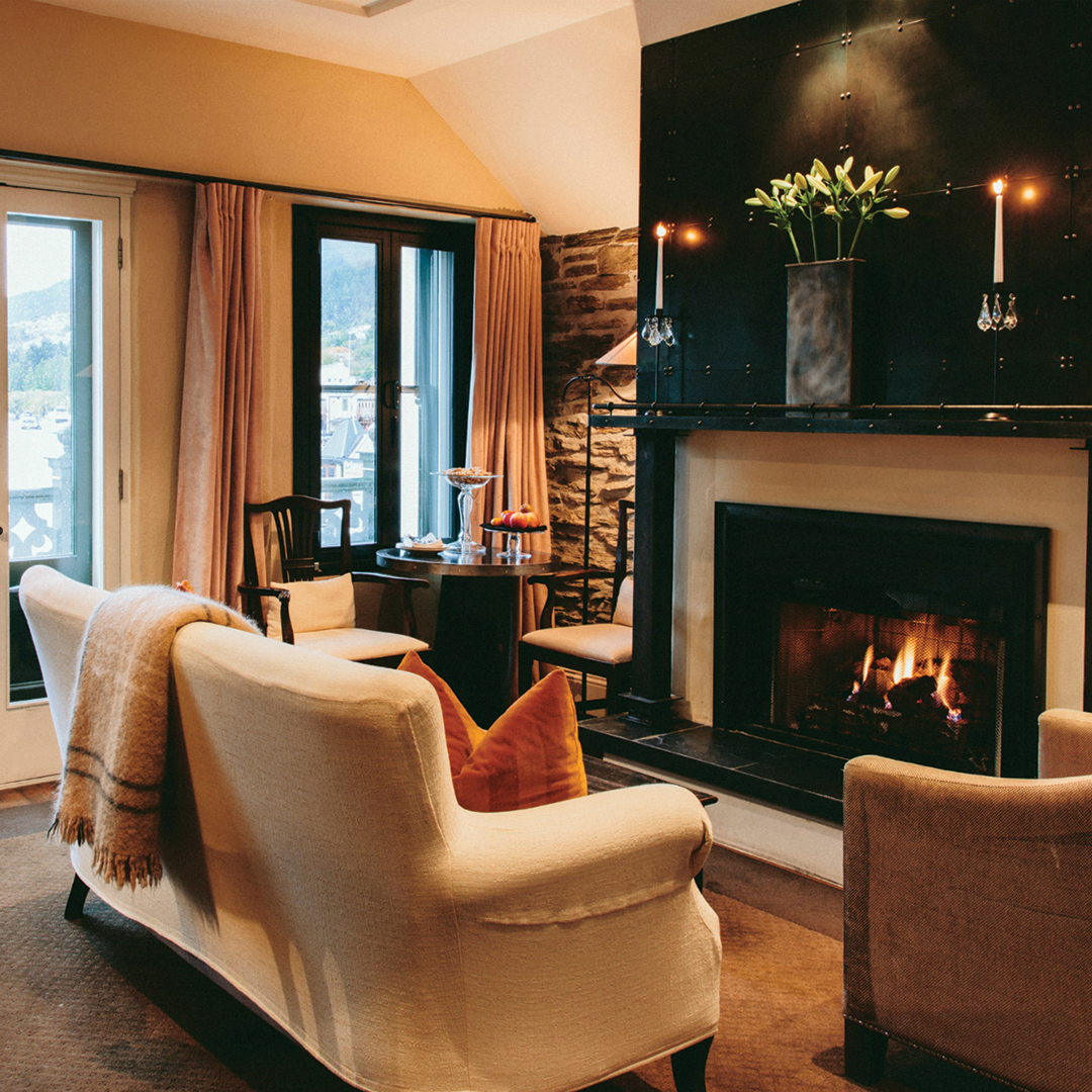 The main hotel has five luxurious suites – three Lake View suites have glorious views over Queenstown Bay and Lake Wakatipu while the two Mountain View suite options scan out across Queenstown Township and up to the Skyline Gondola. Each 80m²-plus suite includes a super king bed, large dressing room, double bathroom and lounge area featuring a gas fireplace, soft furnishings and cut flowers.