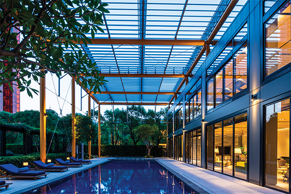 Apartments within One Park Taipei are elevated above 12-metre tall entrance lobbies to give uninterrupted views from their spacious balconies and terraces. Each floor can be used as a single apartment of around 600m² or can be divided in half to create two smaller units. Landscaped gardens featuring mature trees and water features visually link the towers’ two sites, while the rear of the buildings house outdoor swimming pools with canopies for both shade and privacy, a gym and residents’ club.