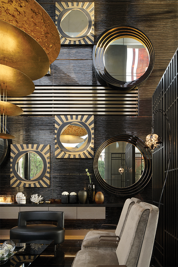Interiors are based on Western and Oriental elements and incorporate their charisma and native culture. The design highlights each building’s sensory experiences with glittering suspended artworks representing planets orbiting the globe. The combination of gold and silver colour palettes and fine materials and furnishings provide the perfect surroundings for a grand and exclusive lifestyle.