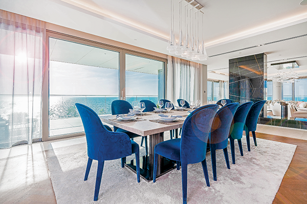 Spread over 15,243 square feet, this four-bedroom penthouse provides the ultimate in comfort with its open-plan layout, spacious bedrooms and fully fitted kitchen. Floor-to-ceiling windows allow natural light and offer the most breath-taking panoramas of Dubai’s stunning skyline and the Arabian Gulf’s golden sunsets.