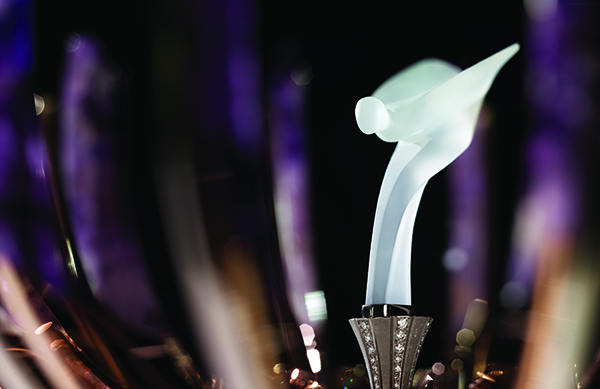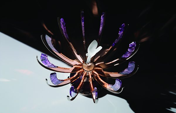 For the first time in history, an iteration of the Spirit of Ecstasy, the enigmatic mascot that has adorned Rolls-Royce motor cars since 1911, is cocooned in an exquisite, contemporary, Fabergé Egg. It rests on a hand-engraved, purple enamel guilloché base of 18 karat white gold. Upon operating the movement via a discreet lever, a sense of theatre ensues as the boughs open to present the Spirit of Ecstasy, hand-sculpted in frosted rock crystal. The rose gold vanes, embellished with round white diamonds, reveal swathes of amethyst, specially selected for its colour and quality.