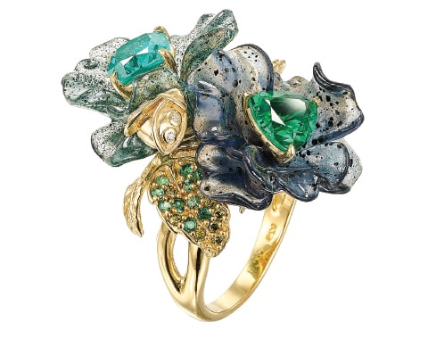 The process involves crushing, simmering, drying, and curing to form rough stones that are later cut and polished by hand. The collection also introduces Regenerative-Gemstones, made from autumn leaves and recycled lapidary offcuts. It’s a practical response to waste, and a reminder that value can be made, not just found.