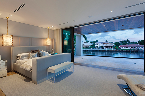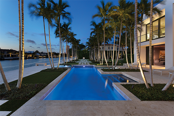 Stunning residence with five bedrooms, five full and three half bathrooms, an elevator and a four-bay garage. Its dramatic two-storey, window-walled living and dining rooms combine in a fabulous open space set off by a coral and onyx see-through linear fireplace and a cove-lit mahogany ceiling. Separated from the main living space by a walnut accent wall, the bespoke kitchen is fully equipped with high quality appliances. In the southwest wing, the master suite is a dream-like sanctuary with view-filled window walls and a large covered balcony that seems to float above the Intracoastal Waterway.
