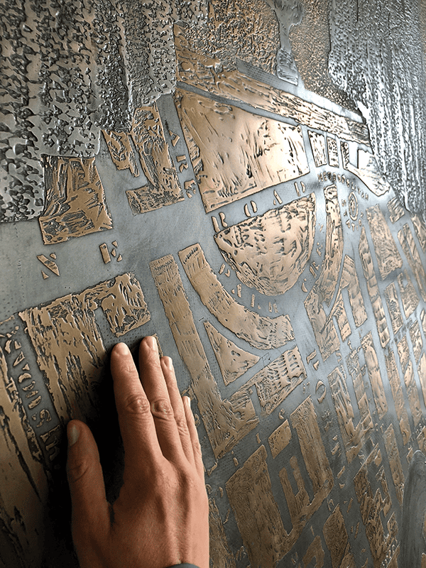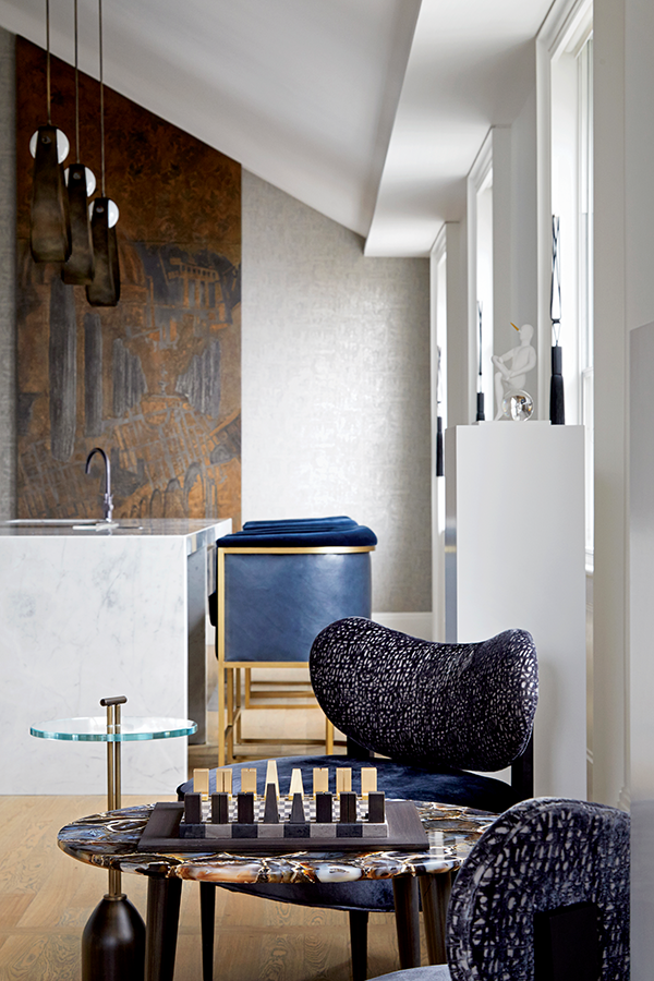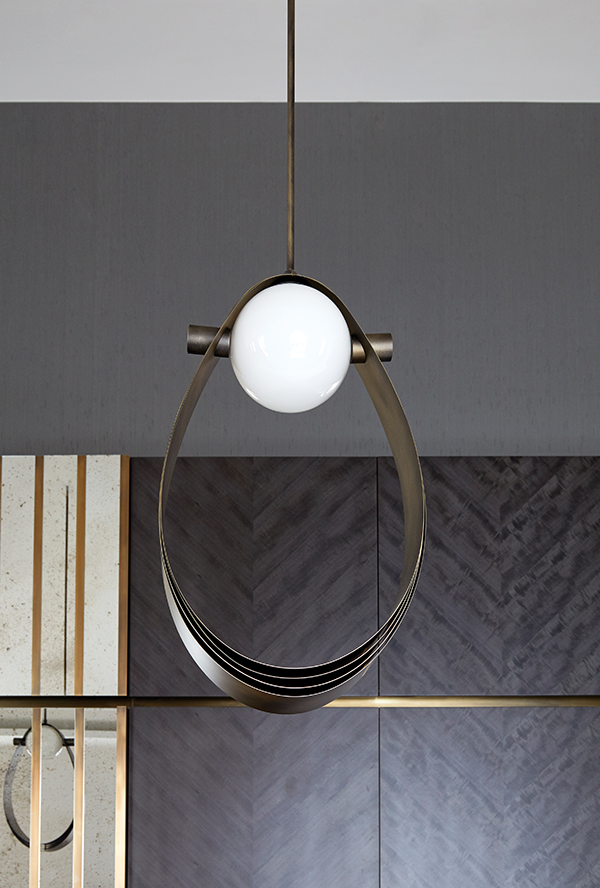 We used an antique mirror to visually double up the space and enhance the visual impact creating an experience within the space, antique brushed brass for understated luxury and luxurious herringbone veneers. We also designed the lighting unit above the bar which was inspired by a pearl earring fully transformed into a pendant light for ambiance and dramatic evening light. The finishing touch was our specially designed liquid bronze mural featuring Marylebone and Regents Park.