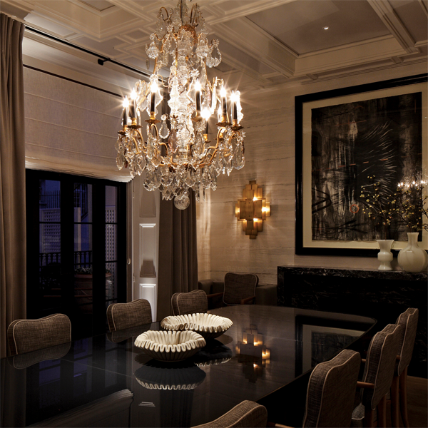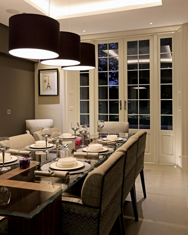 Avoid decorative lights in a dining room that are non-dimmable and cold LED light sources. If you have a chandelier over your dining table, this will provide ambient light within the space, but this should be dimmed and downlights added to provide the focus and create intimacy.