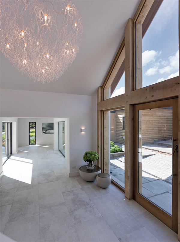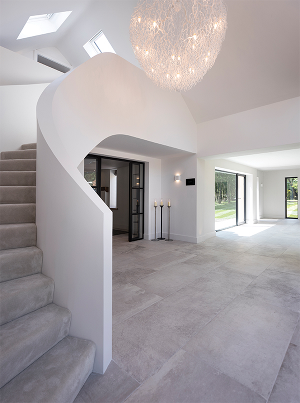 With Janey Butler Interiors’ and Llama Architects’ multi-award winning Forest Cottage project, a new, vaulted glass entrance with a solid oak frame was created; linking the old cottage, marrying the old and new together seamlessly. The space is clean, white and flooded with natural light; the focal point a bespoke plastered staircase connecting one elevation to another.
