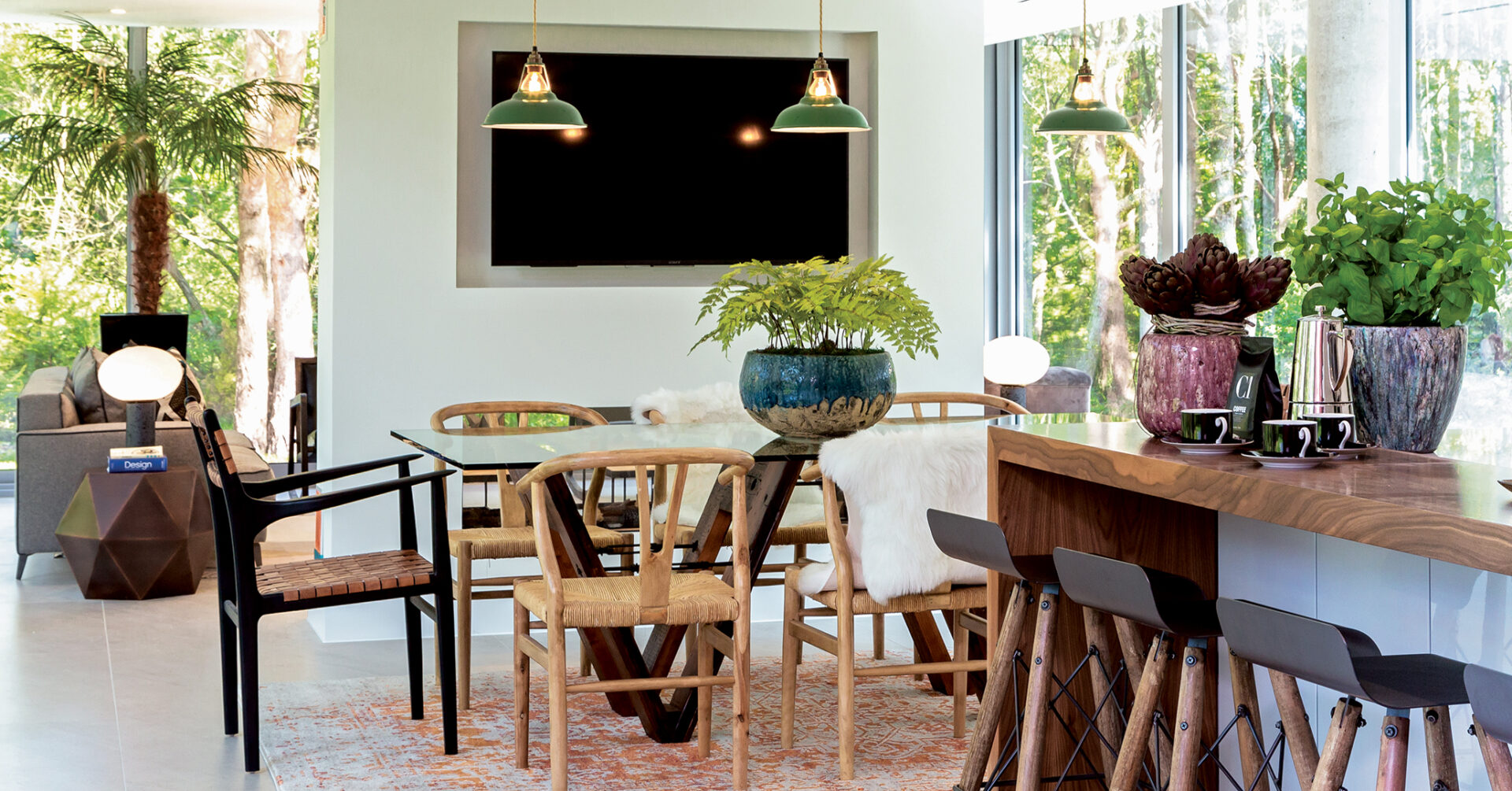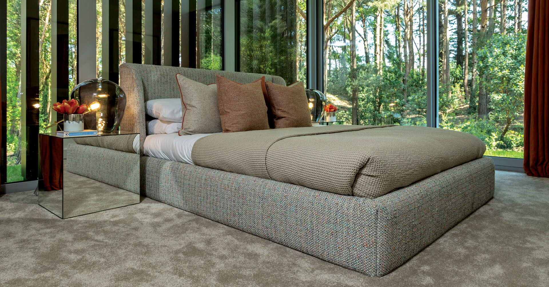 Alexander James Interiors (AJI) has designed and styled the interiors of Ortega, which is on the largest plot. This stunning L-shaped house makes the most of its position with its open plan living space and terraces overlooking the adjoining trees and grounds. The brief for the project was to create a post-modern interior with a Danish twist, while the design inspiration was for a contemporary dwelling in the woods.