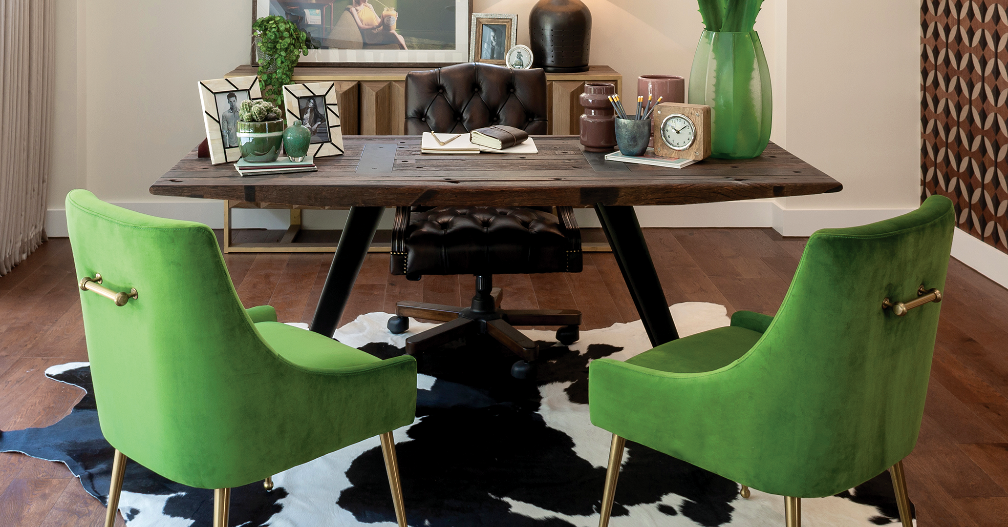 The huge expanses of glass framed by beautiful wooden fenestration fins create natural shadow patterns and provide additional privacy. Furniture made from natural wood, with interesting textures and finishes, plays an important part in linking the house to the natural world outside. A particularly stunning feature is AJI’s creation of a fabulous gallery effect. This has been achieved by commissioning original artwork and combining it with quirky vintage pieces and bespoke items.