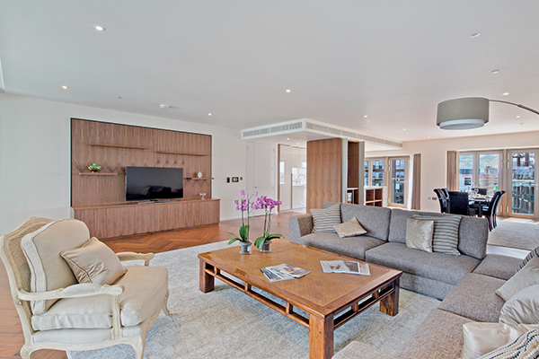 A very spacious three-bedroom apartment with 2,193 square feet of living space. It features a huge dual aspect living room and open plan kitchen with views towards the River Thames and south facing internal views. There are three double bedrooms with fitted wardrobes, three bathrooms with two en suite and a separate utility room.