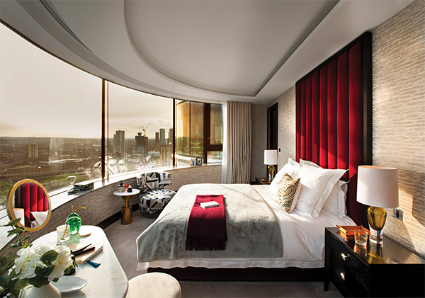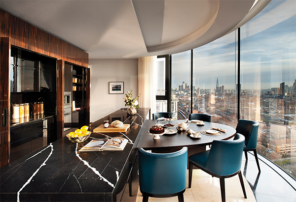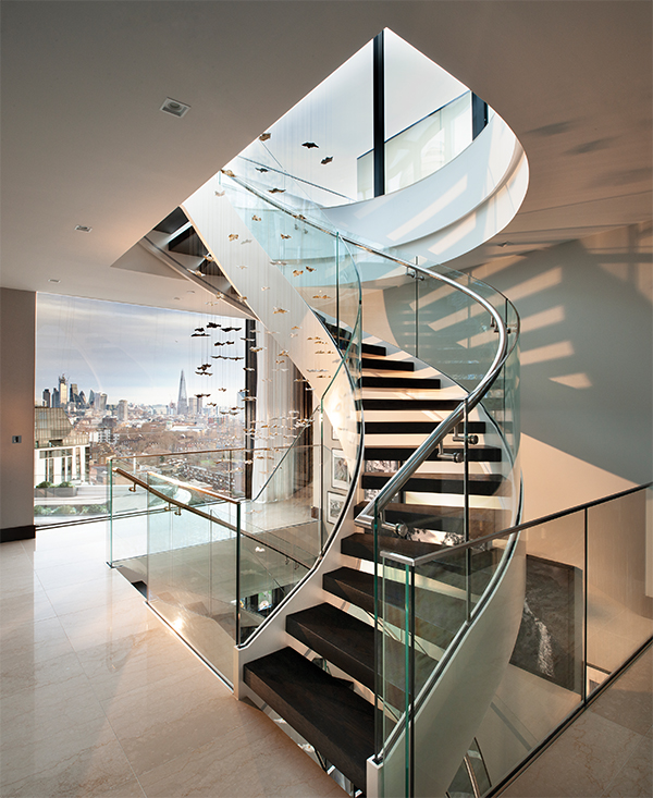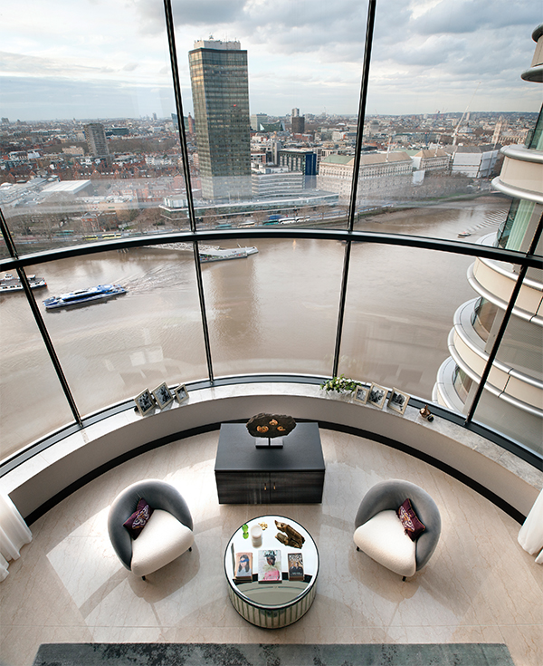 The duplex offers 5,520 square feet of space, with a bespoke helical staircase connecting each floor. It includes four bedrooms, with en suite bathrooms, a reception and living room, dining room, private office, mezzanine and two kitchens. All rooms feature curved floor-to-ceiling windows which frame the spectacular views. There is also a private 1,905-foot roof terrace with an outdoor kitchen and 360-degree views across London.