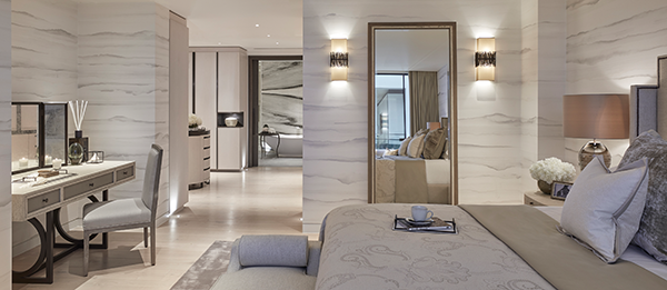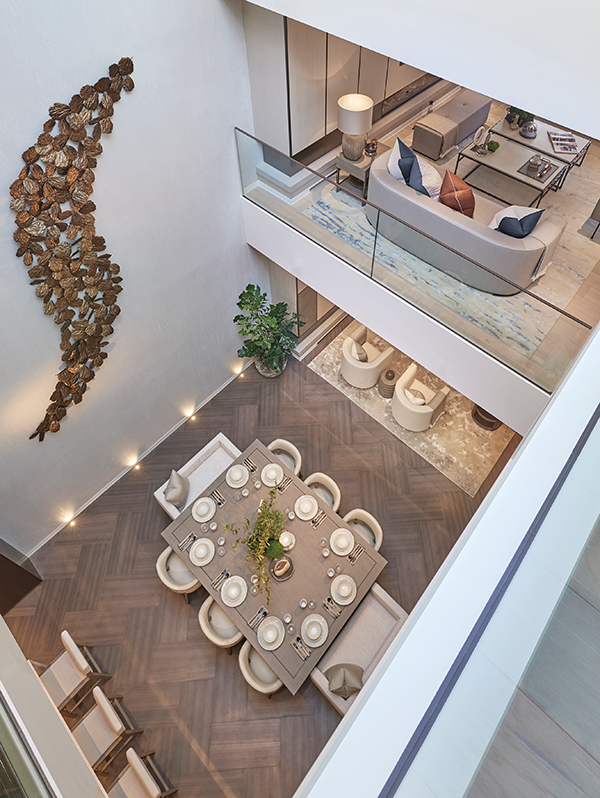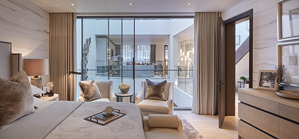 The full height sliding glass doors within the atrium create beautifully bright and flexible spaces which can be opened to provide an essentially fully open plan house or closed to allow privacy. On the top floor, a sky bridge links the guest bedroom at the rear of the house to two further bedrooms, a utility room and a bathroom. Facilities include a 24-hour concierge and underground parking.
