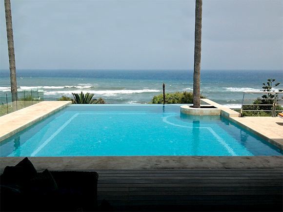 The build, of around 1,100m², on three levels with an elevator, features a modern interior with large master suite, indoor and outdoor swimming pools, a self-contained guest house, an open-air car port, beach access and a gated drive.