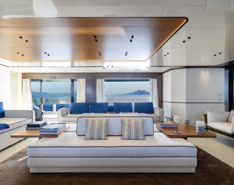 The owner’s suite includes a Galaxy-blue palette, leather details, and a marble bathroom with hammam. Guest accommodation comprises four en-suite cabins below deck.