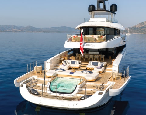 Crafted with a steel hull and aluminium superstructure, she offers expansive outdoor areas across three aft levels, including a scenic pool with fold-out balconies and a sea-level platform just 50cm above the water. Interiors feature natural oak, Vetrite panels, Sicis mosaics and custom furnishings, creating a modern yet warm atmosphere.