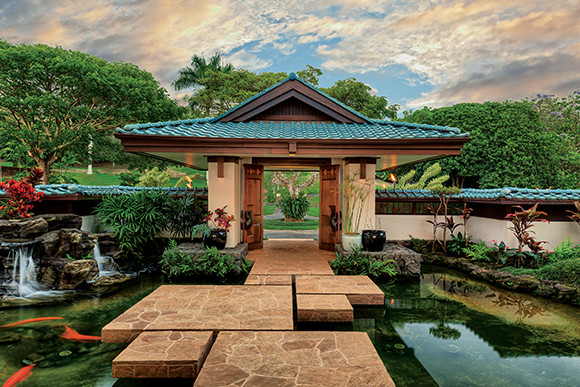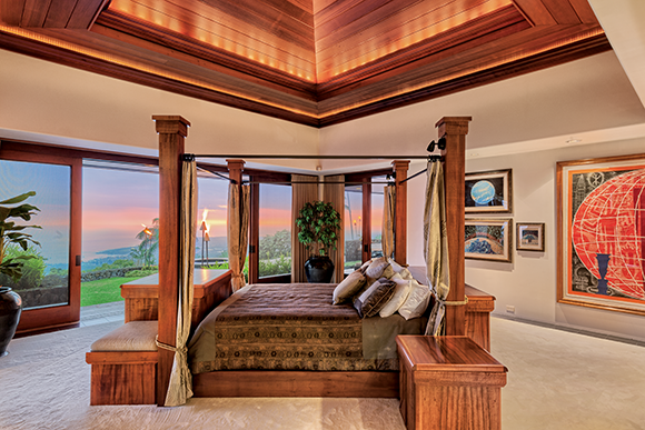 This three-bedroom, three bathroom estate on the western slopes of Hualalai Mountain has expansive views of the Kona coastline. The property is entered through an orchard of citrus and macadamia nut trees before crossing a picturesque bridge leading up to the canopy of a mature monkey pod tree at the grand entrance of the main residence.