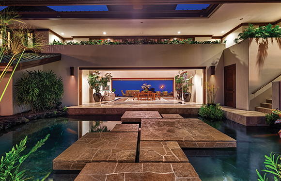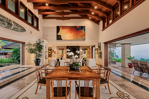 The central living area, with its soaring ceilings, transom windows, and massive dining table was created for entertaining. A walk-in, temperature controlled wine room off the kitchen holds approximately 1,600 bottles. Located on a wing off the central living area, the expansive master bedroom and bathroom includes an outdoor shower and an adjoining office. Two additional guest suites are located on the second level, each with a separate entrance and secondary spiral staircase off a private balcony down to the poolside lanai. In addition to the 5,391 square feet, residence, lanais surround a mosaic tiled pool and second infinity-edge swimming pool overlooking a pond.