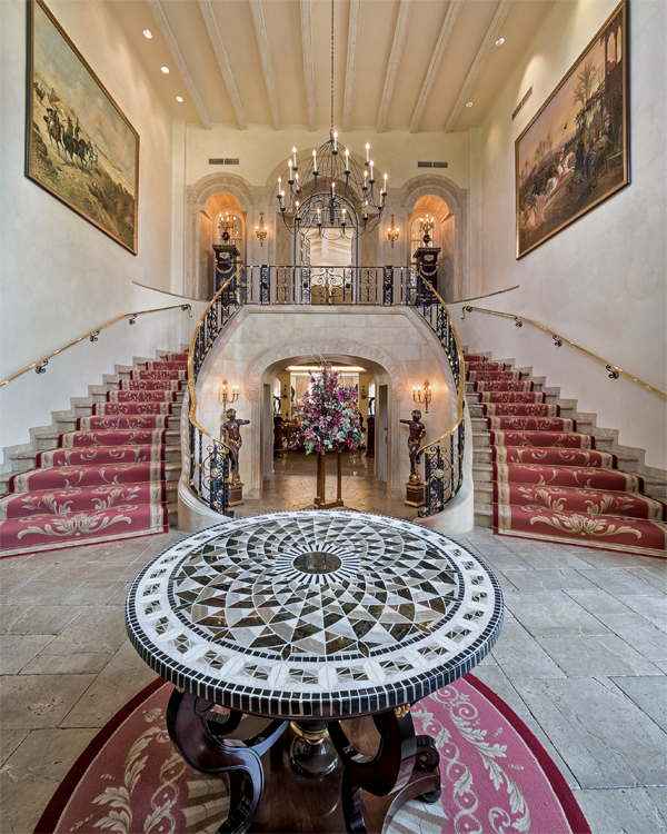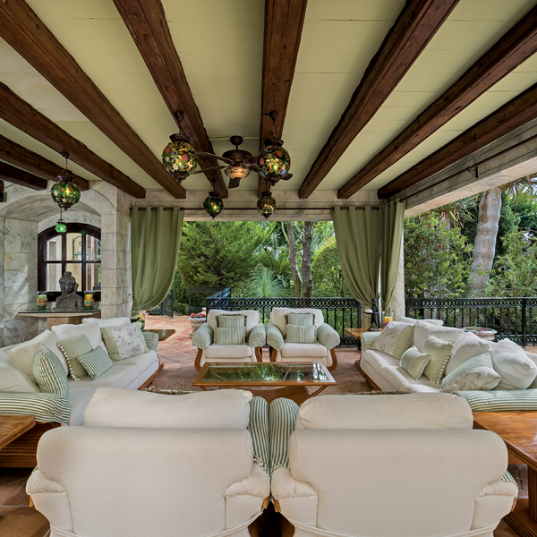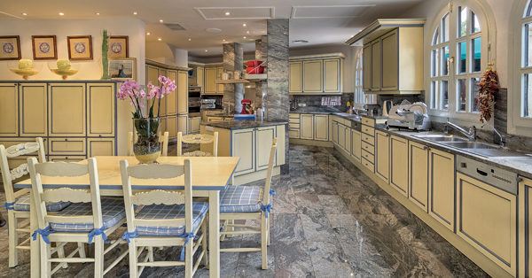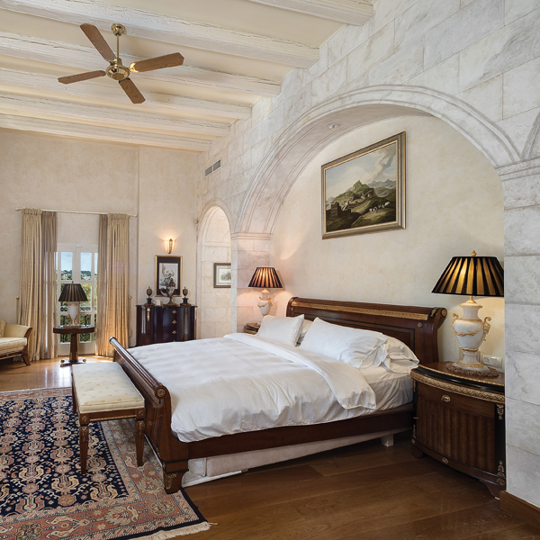 The master bedroom with two en suite bathrooms and two large dressing rooms is on the upper floor, while the other five en suite bedrooms are distributed around the house. Most of the decoration and furniture are authentic Versace with floors being a combination of Carrara marble, natural stone and antique marble.
