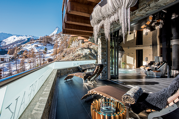 High above the village with magnificent views to the mountains and Matterhorn, this rental chalet is centrally located, yet private and secluded. Set over six levels, each with floor-to-ceiling windows, its modern, open-plan layout includes a large corner-seating sofa under a glass roof, a library area with open fire, dining area and open kitchen. The lounge balcony offers additional outdoor space.