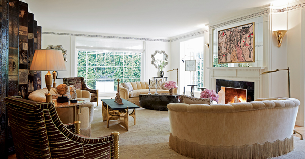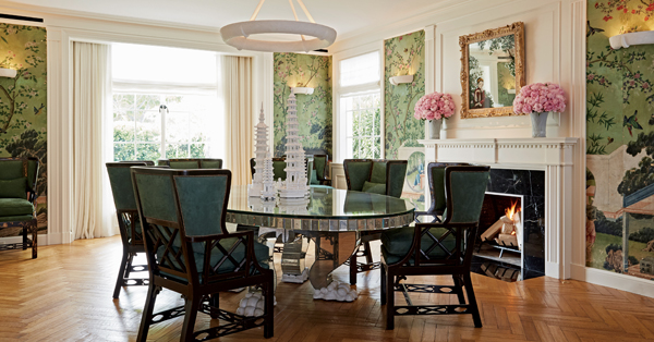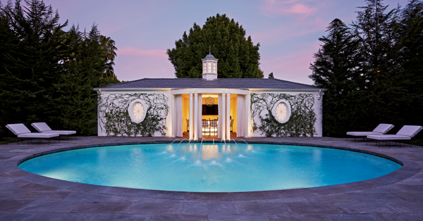 Features include formal living rooms, a Ruhlmann-inspired library, bar, billiards, grand morning room, spectacular kitchen with a mosaic ceiling and an elliptical dining room with bronze Parisian screens and expansive poolside views. Reminiscent of old Hollywood, the stunning master suite includes his/her marble bathrooms and an intimate living room.